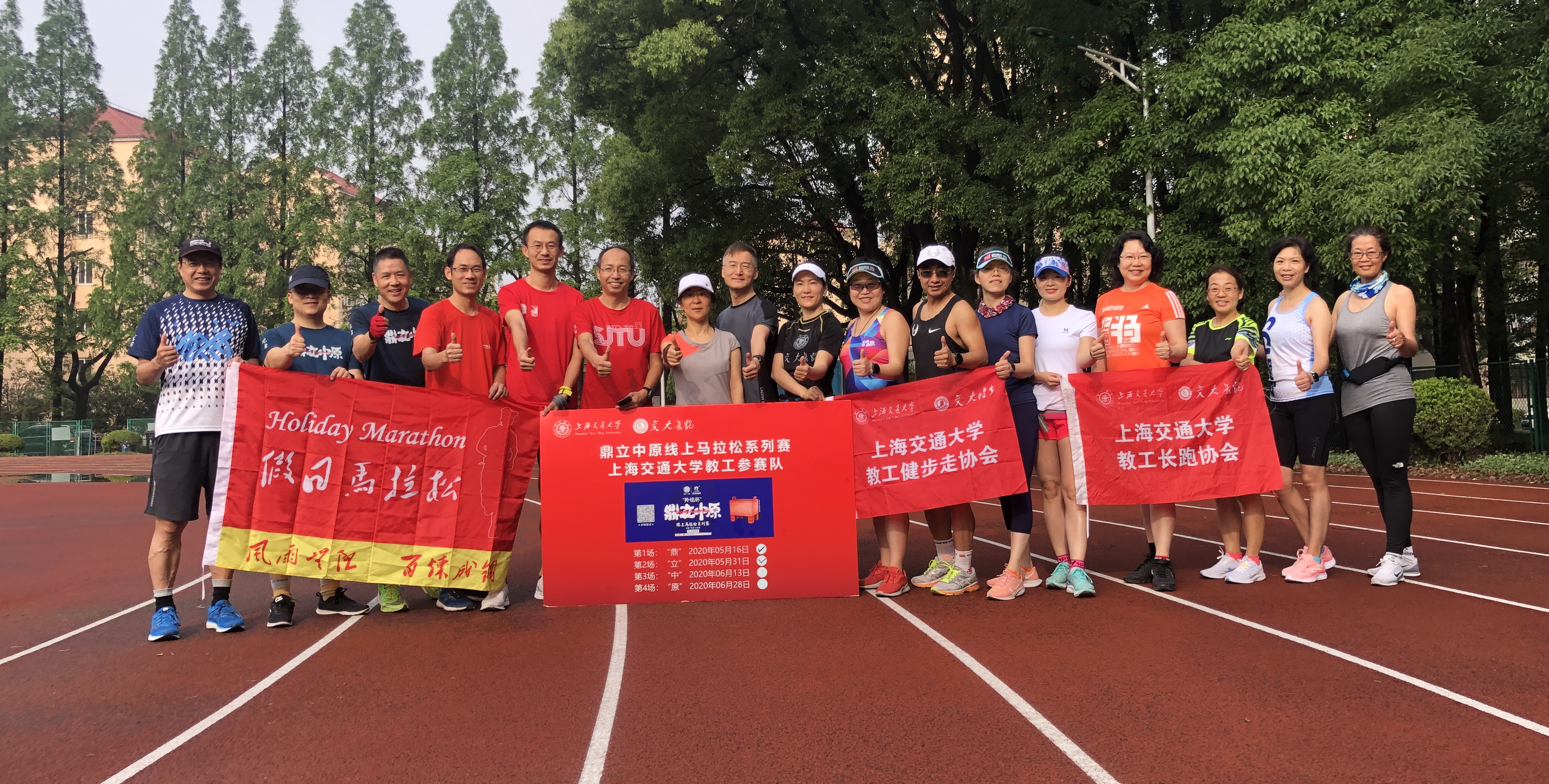 5月31日,是“2020鼎立中原线上马拉松系列赛”的第2场比赛。校长跑协会、健步走协会的18名长跑爱好者相继赶到闵行校区南区体育场集合,参与本次赛事。